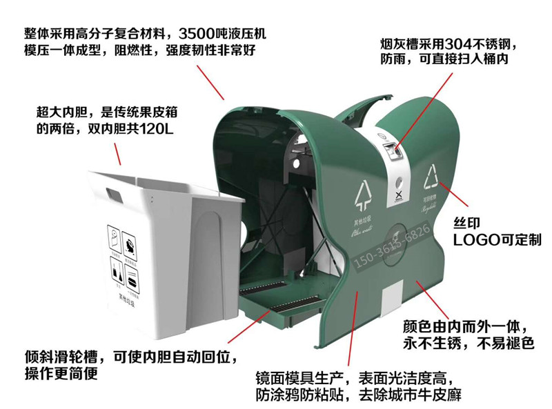 產(chǎn)品特點(diǎn): 鏡面模具生產(chǎn),表面光潔度高,防涂鴉防粘貼,防砸,耐燒,永不生銹,不易褪色,耐酸堿,易清洗,使用壽命長(zhǎng),具有天然的防盜功能;操作簡(jiǎn)單,深受環(huán)衛(wèi)系統(tǒng)客戶青睞。