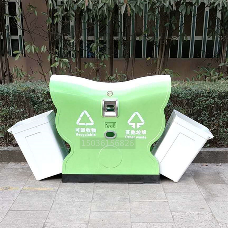 4.側板文字標識采用絲網印刷,印刷有“可回收物” “其他垃圾”,分類標識參照《城市生活垃圾分類標識》規定的名稱、圖形、符號和顏色要求,LOGO可定制。