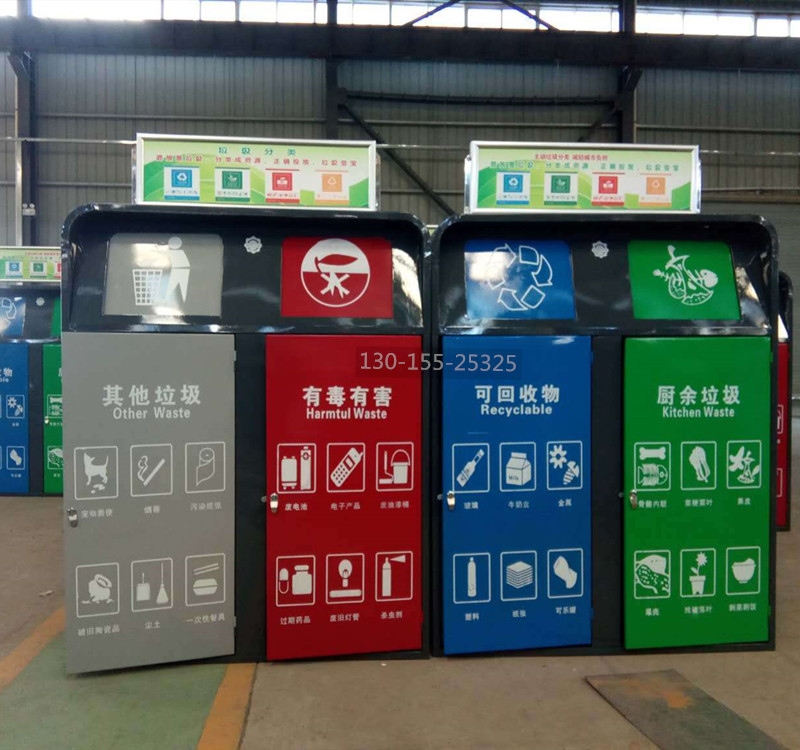分類垃圾桶整體采用優質冷軋鋼板加工而成,表面經過除油、噴砂防銹處理后,再進行酸洗磷化處理;表面清理干燥后整體進行靜電噴涂或烤漆處理,靜電噴涂是經過流水線高溫固化爐固化后再出爐冷卻,加工后的塑粉附著力強,不易剝落。